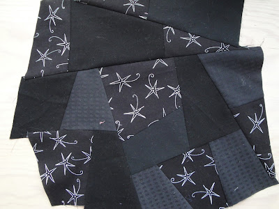 I needed a black background for a little quilt and being smack down in the middle of a scrappy love fest I wanted to piece one. I had a few black scraps in the box in which I never seem to make a dent even with the Intuition Quilt in progress. I wish my bank account worked the same way.